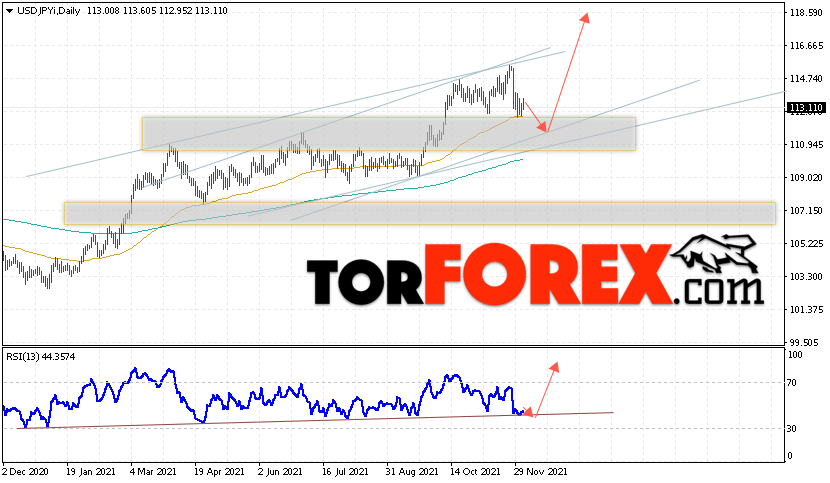 Дополнительным сигналом в пользу подъёма пары Доллар Иена на текущий торговой неделе выступит тест восходящей линии тренда на индикаторе относительной силы. Вторым сигналом станет отскок от нижней границы бычьего канала. Отменой варианта подъёма пары USD/JPY на текущей торговой неделе 6 — 10 декабря 2021 выступит падение и пробой области 109.15. Такой вариант укажет на пробой области поддержки и продолжение падения пары на Форекс в область ниже уровня 106.55. Подтверждением подъёма по паре USD/JPY выступит пробой области сопротивления и закрытие цены над уровнем 114.85.