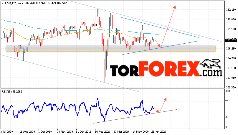 Дополнительным сигналом в пользу роста пары Доллар Иена на текущий торговой неделе выступит тест линии тренда на индикаторе относительной силы. Вторым сигналом станет отскок от нижней границы модели «Треугольник». Отменой варианта роста пары USD/JPY на текущей торговой неделе 6 — 10 июля 2020 выступит падение и пробой области 104.35. Такой вариант укажет на пробой области поддержки и продолжение падения пары на Форекс в область ниже уровня 100.25. Подтверждением роста по паре USD/JPY выступит пробой области сопротивления и закрытие над уровнем 110.25.