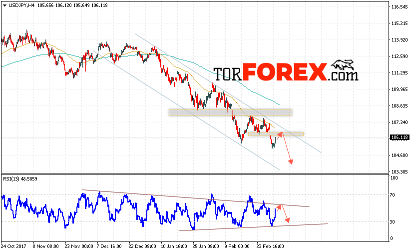 Таким образом, USD/JPY прогноз Доллар Иена на 6 марта 2018 предполагает попытку теста верхней границы нисходящего канала вблизи области 107.20 и продолжения падения котировок в область ниже уровня 104.40, в пользу падения выступит тест нисходящей линии тренда на индикаторе относительной силы, отменой варианта снижения станет пробой области 107.65.