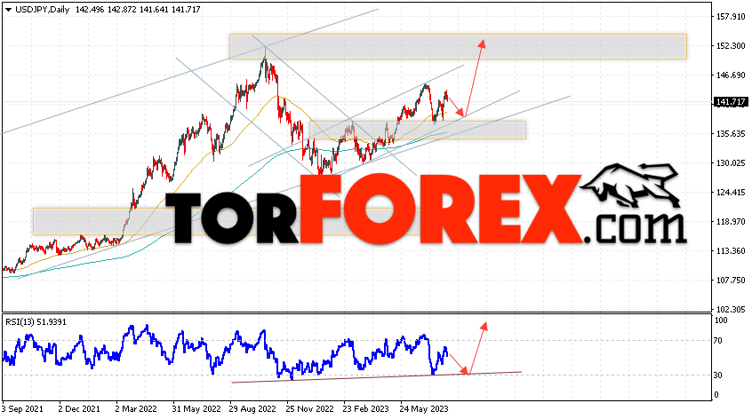 Дополнительным сигналом в пользу подъёма пары Доллар Иена на текущий торговой неделе выступит тест линии тренда на индикаторе относительной силы. Вторым сигналом станет отскок от нижней границы бычьего канала. Отменой варианта роста пары USD/JPY на текущей торговой неделе 7 — 11 августа 2023 выступит падение и пробой области 133.75. Такой вариант укажет на пробой области поддержки и продолжение падения пары на Форекс в область ниже уровня 132.05. Подтверждением росту по паре USD/JPY выступит пробой области сопротивления и закрытие цены над уровнем 147.05.