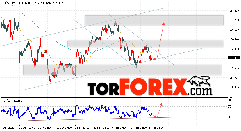 Котировки валютной пары Доллар Иена USD/JPY продолжают движение в рамках коррекции и бычьего канала. В момент публикации прогноза курс Доллара США к Японской Иене составляет 131.36. Скользящие средние указывают на наличие краткосрочной медвежьей тенденции по паре. Цены вновь тестируют область между сигнальными линиями, что указывает на давление со стороны продавцов Доллара США и потенциальное продолжение падения цен уже с текущих уровней. В рамках прогноза курса Японской Иены на 7 апреля 2023 стоит ожидать попытку развития коррекции и тест области поддержки вблизи уровня 131.05. Далее, отскок цены вверх и продолжение роста пары USD/JPY в область выше уровня 136.35.
