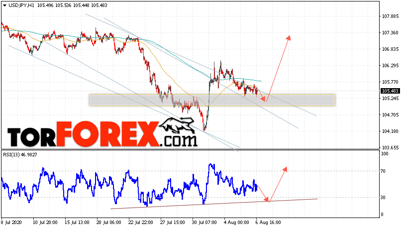 Таким образом, USD/JPY прогноз Доллар Иена на 7 августа 2020 предполагает попытку теста области поддержки вблизи уровня 105.05. Затем, продолжение роста котировок в область выше уровня 107.35. В пользу подъёма пары выступит тест линии тренда на индикаторе относительной силы. Отменой варианта подъёма станет падение и пробой области 104.55. Это укажет на пробой уровня поддержки и продолжение развития нисходящего движения по паре с потенциальной целью ниже уровня 102.65.