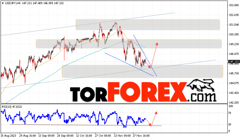 Котировки валютной пары Доллар Иена USD/JPY продолжают движение в рамках развития коррекции и формирования разворотной модели «Клин». В момент публикации прогноза курс Доллара США к Японской Иене составляет 147.13. Скользящие средние указывают на наличие краткосрочной медвежьей тенденции по паре. Цены пробили область между сигнальными линиями вниз, что указывает на давление со стороны продавцов Доллара США и потенциальное продолжение падения цен уже с текущих уровней. В рамках прогноза курса Японской Иены на 7 декабря 2023 стоит ожидать попытку развития падения цены и тест области поддержки вблизи уровня 146.35. Далее, отскок цены вверх и продолжение роста пары USD/JPY в область выше уровня 149.45.