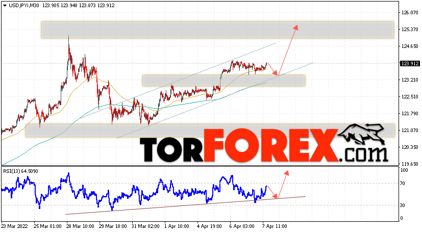 Котировки валютной пары Доллар Иена USD/JPY продолжают движение в рамках роста и бычьего канала. В момент публикации прогноза курс Доллара США к Японской Иене составляет 123.91. Скользящие средние указывают на наличие краткосрочной бычьей тенденции по паре. Цены пробили вверх область между сигнальными линиями, что указывает на давление со стороны покупателей Доллара США и потенциальное продолжение роста цен уже с текущих уровней. В рамках прогноза курса Японской Иены на 8 апреля 2022 стоит ожидать попытку развития снижения и тест области поддержки вблизи уровня 123.30. Далее, отскок цены вверх и продолжение подъёма пары USD/JPY в область выше уровня 125.35.