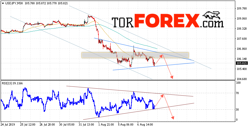 Таким образом, USD/JPY прогноз Доллар Иена на 8 августа 2019 предполагает попытку теста области сопротивления вблизи уровня 106.20. Затем продолжение падения котировок в область ниже уровня 104.65. В пользу снижения пары выступит тест линии тренда на индикаторе относительной силы. Отменой варианта снижения станет сильный рост и пробой области 107.00. Это укажет на пробой уровня сопротивления и продолжение развития подъёма по паре с потенциальной целью выше уровня 109.25.