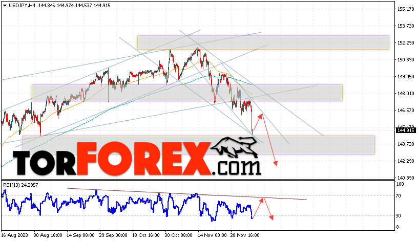 Котировки валютной пары Доллар Иена USD/JPY продолжают движение в рамках развития падения и нисходящего канала. В момент публикации прогноза курс Доллара США к Японской Иене составляет 144.91. Скользящие средние указывают на наличие краткосрочной медвежьей тенденции по паре. Цены пробили область между сигнальными линиями вниз, что указывает на давление со стороны продавцов Доллара США и потенциальное продолжение падения цен уже с текущих уровней. В рамках прогноза курса Японской Иены на 8 декабря 2023 стоит ожидать попытку развития роста цены и тест области сопротивления вблизи уровня 146.05. Далее, отскок цены вниз и продолжение падения пары USD/JPY в область ниже уровня 142.05.