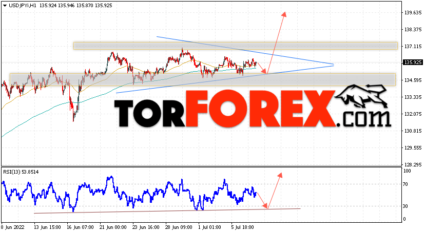 Котировки валютной пары Доллар Иена USD/JPY продолжают движение в рамках коррекции и формирования модели ”Треугольник”. В момент публикации прогноза курс Доллара США к Японской Иене составляет 135.92. Скользящие средние указывают на наличие краткосрочной бычьей тенденции по паре. Цены вновь тестируют область между сигнальными линиями, что указывает на давление со стороны покупателей Доллара США и потенциальное продолжение роста цен уже с текущих уровней. В рамках прогноза курса Японской Иены на 8 июля 2022 стоит ожидать попытку развития падения и тест области поддержки вблизи уровня 134.50. Далее, отскок цены вверх и продолжение роста пары USD/JPY в область выше уровня 139.65.