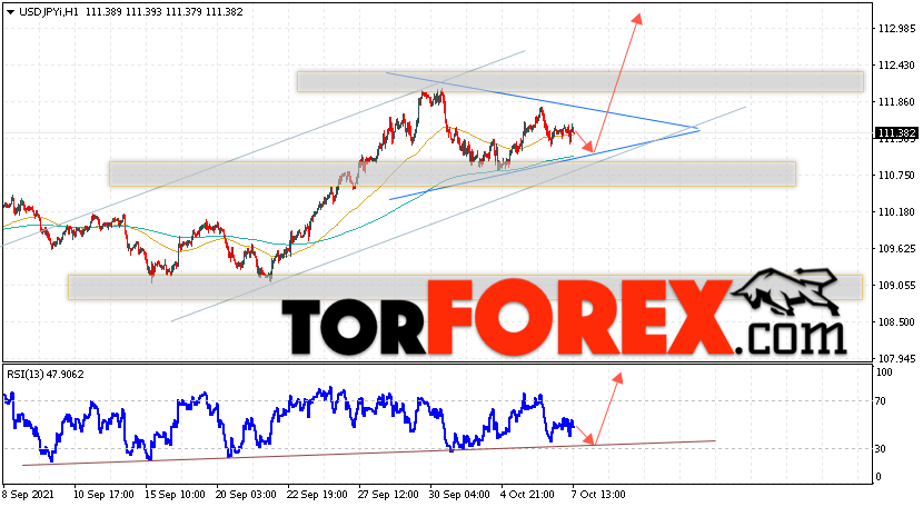 Котировки валютной пары Доллар Иена USD/JPY продолжают движение в рамках коррекции и формирования модели ”Треугольник”. В момент публикации прогноза курс Доллара США к Японской Иене составляет 111.43. Скользящие средние указывают на наличие краткосрочной бычьей тенденции по паре. Цены пробили область между сигнальными линиями вверх, что указывает на давление со стороны покупателей Доллара США и потенциальное продолжение подъёма цен уже с текущих уровней. В рамках прогноза курса Японской Иены на 8 октября 2021 стоит ожидать попытку развития коррекции и тест области поддержки вблизи уровня 110.65. Далее, отскок вверх и продолжение подъёма пары USD/JPY в область выше уровня 112.85.