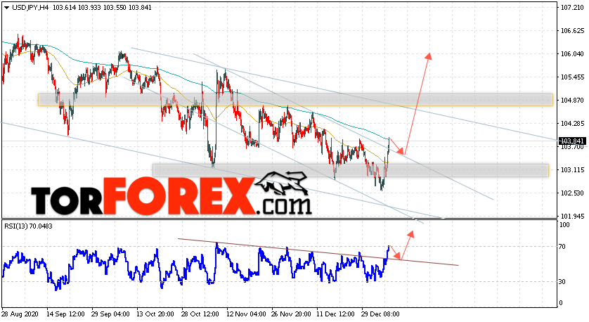 Таким образом, USD/JPY прогноз Доллар Иена на 8 января 2021 предполагает попытку теста области поддержки вблизи уровня 103.45. Затем, продолжение роста котировок в область выше уровня 106.05. В пользу подъёма пары выступит тест линии тренда на индикаторе относительной силы. Отменой варианта роста станет падение и пробой области 102.05. Это укажет на пробой уровня поддержки и продолжение падения по паре с потенциальной целью ниже уровня 100.05.