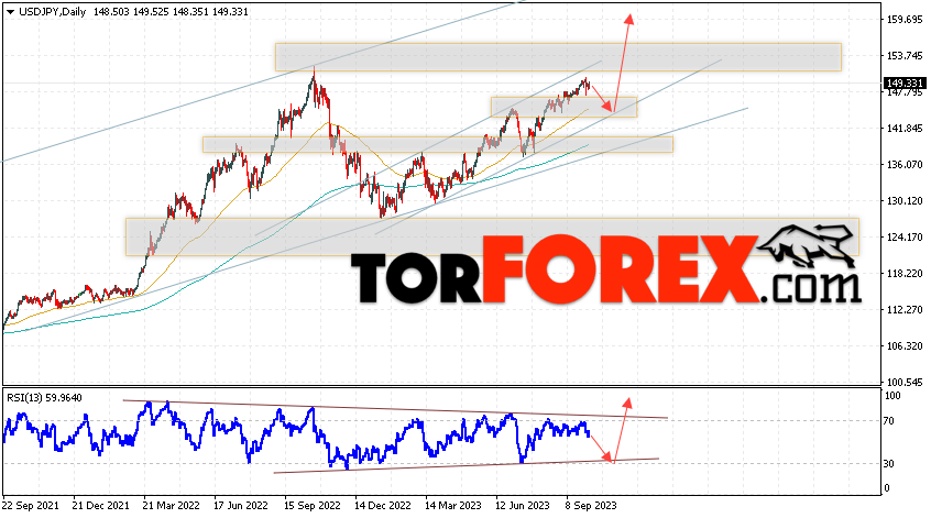 Дополнительным сигналом в пользу подъёма пары Доллар Иена на текущий торговой неделе выступит тест бычьей линии тренда на индикаторе относительной силы. Вторым сигналом станет отскок от верхней границы нисходящего канала. Отменой варианта роста пары USD/JPY на текущей торговой неделе 9 — 13 октября 2023 выступит падение и пробой области 140.65. Такой вариант укажет на пробой области поддержки и продолжение падения пары на Форекс в область ниже уровня 136.05. Подтверждением росту по паре USD/JPY выступит пробой области сопротивления и закрытие цены над уровнем 151.95.