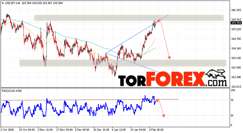 Таким образом, USD/JPY прогноз Доллар Иена на 9 февраля 2021 предполагает попытку теста области сопротивления вблизи уровня 105.75. Затем, продолжение падения котировок в область ниже уровня 103.45. В пользу снижения пары выступит тест линии тренда на индикаторе относительной силы. Отменой варианта падения станет сильный рост и пробой области 106.55. Это укажет на пробой уровня сопротивления и продолжение подъёма по паре с потенциальной целью выше уровня 108.65.