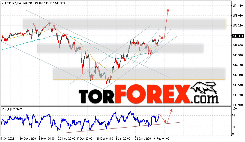 Котировки валютной пары Доллар Иена USD/JPY продолжают движение в рамках развития роста и бычьего канала. В момент публикации прогноза курс Доллара США к Японской Иене составляет 149.35. Скользящие средние указывают на наличие краткосрочной бычьей тенденции по паре. Цены пробили область между сигнальными линиями вверх, что указывает на давление со стороны покупателей Доллара США и потенциальное продолжение роста цен уже с текущих уровней. В рамках прогноза курса Японской Иены на 9 февраля 2024 стоит ожидать попытку развития коррекции цены и тест области поддержки вблизи уровня 148.45. Далее, отскок цены вверх и продолжение роста пары USD/JPY в область выше уровня 153.65.