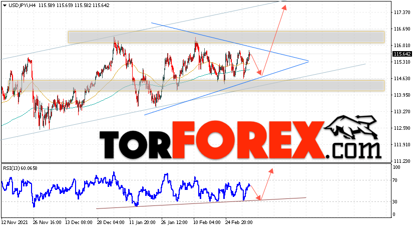 Котировки валютной пары Доллар Иена USD/JPY продолжают движение в рамках коррекции и формирования модели ”Треугольник”. В момент публикации прогноза курс Доллара США к Японской Иене составляет 115.64. Скользящие средние указывают на наличие краткосрочной бычьей тенденции по паре. Цены пробили вверх область между сигнальными линиями, что указывает на давление со стороны покупателей Доллара США и потенциальное продолжение роста цен уже с текущих уровней. В рамках прогноза курса Японской Иены на 9 марта 2022 стоит ожидать попытку развития снижения и тест области поддержки вблизи уровня 114.75. Далее, отскок цены вверх и продолжение подъёма пары USD/JPY в область выше уровня 117.65.
