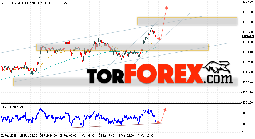 Котировки валютной пары Доллар Иена USD/JPY продолжают движение в рамках коррекции и бычьего канала. В момент публикации прогноза курс Доллара США к Японской Иене составляет 137.25. Скользящие средние указывают на наличие краткосрочной бычьей тенденции по паре. Цены ушли вверх от области между сигнальными линиями, что указывает на давление со стороны покупателей Доллара США и потенциальное продолжение роста цен уже с текущих уровней. В рамках прогноза курса Японской Иены на 9 марта 2023 стоит ожидать попытку развития снижения и тест области поддержки вблизи уровня 136.35. Далее, отскок цены вверх и продолжение роста пары USD/JPY в область выше уровня 139.35.