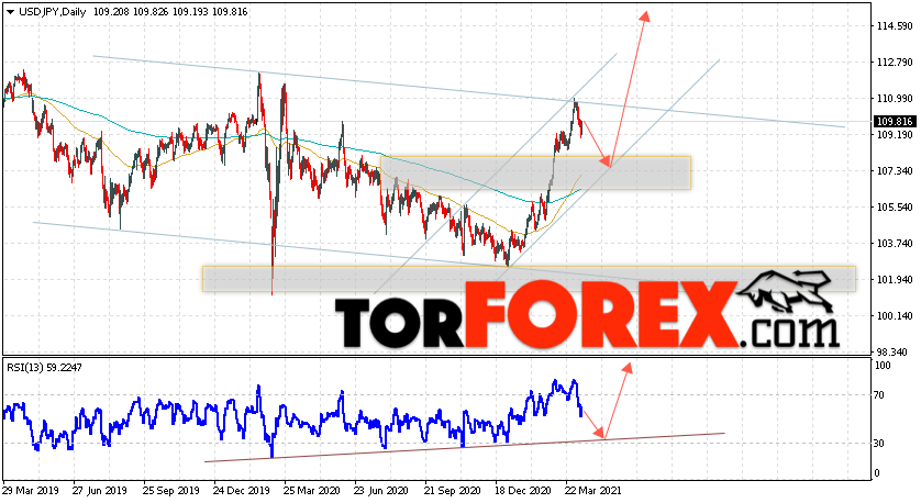 Дополнительным сигналом в пользу подъёма пары Доллар Иена на текущий торговой неделе выступит тест восходящей линии тренда на индикаторе относительной силы. Вторым сигналом станет отскок от нижней границы бычьего канала. Отменой варианта подъёма пары USD/JPY на текущей торговой неделе 12 — 16 апреля 2021 выступит падение и пробой области 105.35. Такой вариант укажет на пробой области поддержки и продолжение падения пары на Форекс в область ниже уровня 99.45. Подтверждением подъёма по паре USD/JPY выступит пробой области сопротивления и закрытие цены над уровнем 111.95.