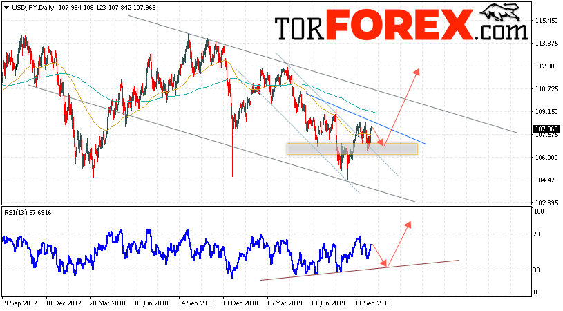 В пользу подъёма пары Доллар Иена выступит тест линии поддержки на индикаторе относительной силы. Вторым сигналом станет завершение формирования «Правого Плеча» разворотной модели. Отменой варианта роста пары USD/JPY на текущей торговой неделе 14 — 18 октября 2019 выступит падение и пробой области 104.05. Такой вариант укажет на пробой нижней границы нисходящего канала и продолжение снижения пары на Форекс в область ниже уровня 102.15. Подтверждением роста по паре USD/JPY выступит пробой верхней границы нисходящего канала и закрытие над уровнем 109.35.