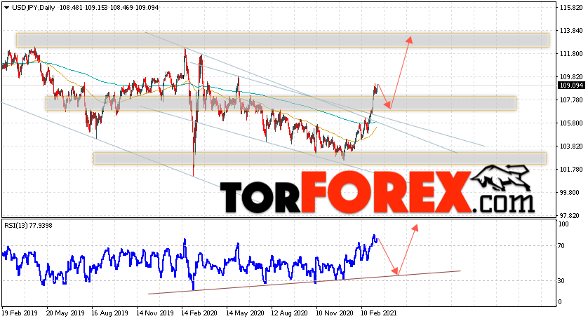 Дополнительным сигналом в пользу подъёма пары Доллар Иена на текущий торговой неделе выступит тест восходящей линии тренда на индикаторе относительной силы. Вторым сигналом станет отскок от верхней границы нисходящего канала. Отменой варианта подъёма пары USD/JPY на текущей торговой неделе 15 — 19 марта 2021 выступит падение и пробой области 103.75. Такой вариант укажет на пробой области поддержки и продолжение падения пары на Форекс в область ниже уровня 98.25. Подтверждением подъёма по паре USD/JPY выступит пробой области сопротивления и закрытие цены над уровнем 110.85.