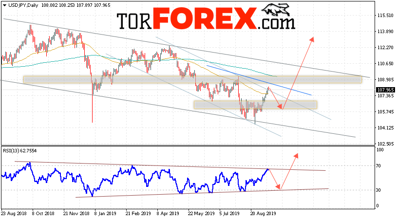 В пользу подъёма пары Доллар Иена выступит тест линии поддержки на индикаторе относительной силы. Вторым сигналом станет завершение формирования перевернутой модели «Голова и плечи». Отменой варианта роста пары USD/JPY на текущей торговой неделе 16 — 20 сентября 2019 станет падение и пробой области 103.85. Такой вариант укажет на пробой нижней границы нисходящего канала и продолжение снижения пары на Форекс в область ниже уровня 102.35. Подтверждением роста по паре USD/JPY выступит пробой верхней границы нисходящего канала и закрытие над уровнем 108.45.
