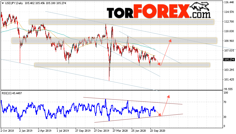 Дополнительным сигналом в пользу роста пары Доллар Иена на текущий торговой неделе выступит тест линии тренда на индикаторе относительной силы. Вторым сигналом станет отскок от нижней нисходящего канала. Отменой варианта роста пары USD/JPY на текущей торговой неделю 19 — 23 октября 2020 выступит падение и пробой области 101.85. Такой вариант укажет на пробой области поддержки и продолжение падения пары на Форекс в область ниже уровня 98.55. Подтверждением роста по паре USD/JPY выступит пробой области сопротивления и закрытие над уровнем 107.45, что укажет на пробой верхней границы канала.