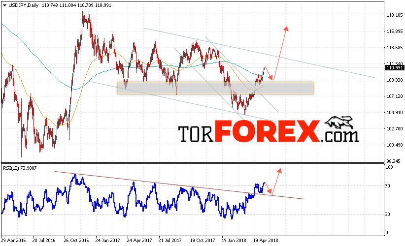 Таким образом, USD/JPY прогноз Доллар Иена на неделю 21 — 25 мая 2018 предполагает попытку теста уровня поддержки вблизи области 108.50, откуда стоит ожидать продолжения роста пары в область выше уровня 115.50, дополнительным сигналом в пользу роста выступит тест линии тренда на индикаторе относительной силы, отменой варианта роста пары станет пробой уровня 107.00, что укажет на продолжение падения пары.