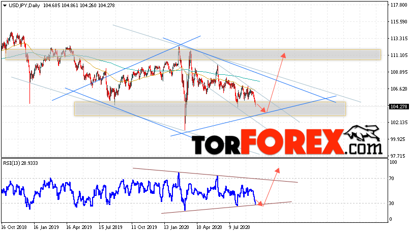 Дополнительным сигналом в пользу роста пары Доллар Иена на текущий торговой неделе выступит тест линии тренда на индикаторе относительной силы. Вторым сигналом станет отскок от нижней границы модели ”Алмаз”. Отменой варианта роста пары USD/JPY на текущей торговой неделю 21 — 25 сентября 2020 выступит падение и пробой области 102.55. Такой вариант укажет на пробой области поддержки и продолжение падения пары на Форекс в область ниже уровня 99.65. Подтверждением роста по паре USD/JPY выступит пробой области сопротивления и закрытие над уровнем 109.05, что укажет на пробой верхней границы паттерна и начала его полноценной отработки.