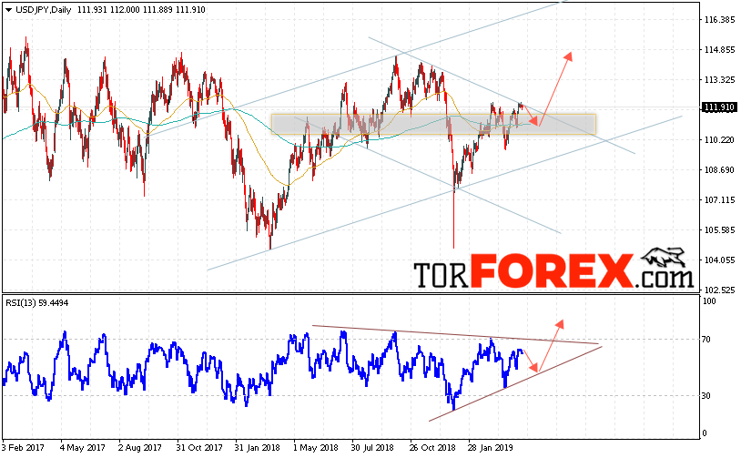 Таким образом, USD/JPY прогноз Доллар Иена на неделю 22 — 26 апреля 2019 предполагает попытку теста уровня поддержки вблизи области 111.45. Откуда стоит ожидать продолжения роста пары в область выше уровня 114.85. Дополнительным сигналом в пользу подъёма выступит тест линии тренда на индикаторе относительной силы. Отменой варианта роста пары станет падение и пробой уровня 109.25. Это укажет на продолжение снижения пары.