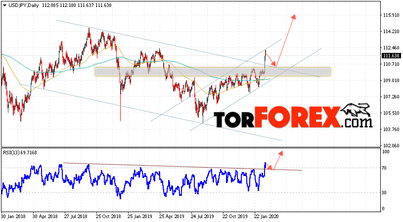 В пользу роста пары Доллар Иена выступит тест линии тренда на индикаторе относительной силы. Вторым сигналом станет отскок от верхней границы нисходящего канала. Отменой варианта роста пары USD/JPY на текущей торговой неделе 24 — 28 февраля 2020 выступит падение и пробой области 109.35. Такой вариант укажет на пробой области поддержки и продолжение падения пары на Форекс в область ниже уровня 105.65. Подтверждением роста по паре USD/JPY выступит пробой области сопротивления и закрытие над уровнем 112.95.