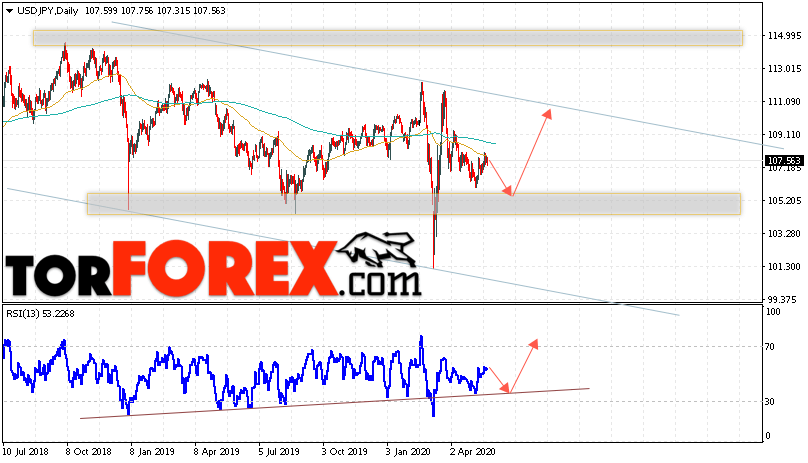 Таким образом, USD/JPY прогноз Доллар Иена на 25 — 29 мая 2020 предполагает попытку теста уровня поддержки вблизи области 105.25. Откуда стоит ожидать продолжения роста пары в область выше уровня 110.95. Дополнительным сигналом в пользу подъёма выступит тест линии тренда на индикаторе относительной силы. Отменой варианта роста пары станет падение и пробой уровня 102.55. Это укажет на продолжение снижения пары с потенциальной целью ниже области 98.55.