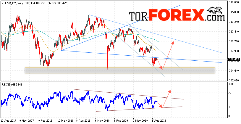 В пользу подъёма пары Доллар Иена выступит тест линии поддержки на индикаторе относительной силы. Вторым сигналом станет отскок от нижней границы восходящей модели «Волна Вульфа». Отменой варианта роста пары USD/JPY на текущей торговой неделе 26 — 30 августа 2019 станет падение и пробой области 103.45. Такой вариант укажет на пробой нижней границы нисходящего канала и продолжение снижения пары на Форекс в область ниже уровня 102.05. Подтверждением роста по паре USD/JPY выступит пробой верхней границы нисходящего канала и закрытие над уровнем 108.25.