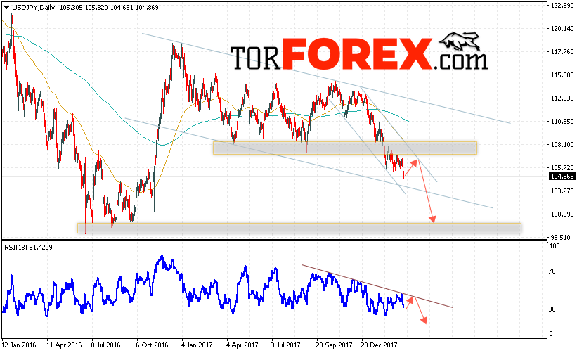 Таким образом, USD/JPY прогноз Доллар Иена на неделю 26 — 30 марта 2018 предполагает попытку теста верхней границы канала вблизи области 105.90, откуда стоит ждать продолжения падения пары в область ниже уровня 100.50, дополнительным сигналом в пользу падения выступит тест линии тренда на индикаторе относительной силы, отменой варианта падения пары станет пробой уровня 108.50, что укажет на продолжение роста пары.