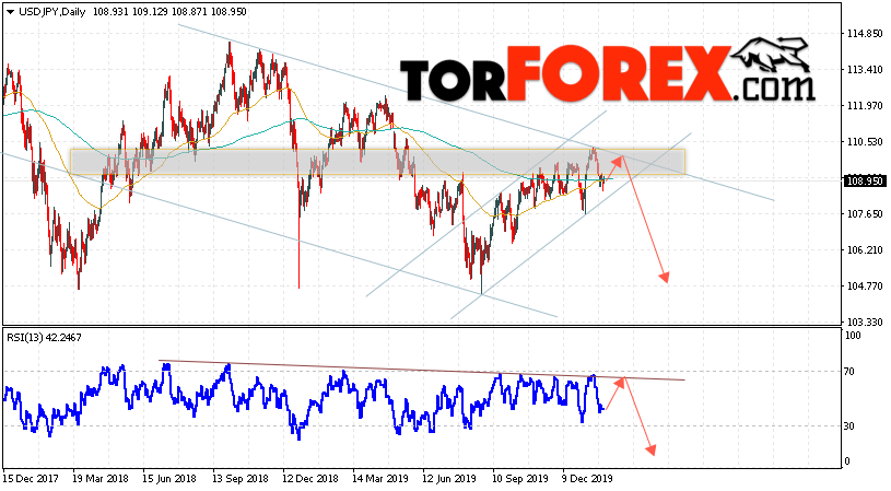 В пользу снижения пары Доллар Иена выступит тест линии сопротивления на индикаторе относительной силы. Вторым сигналом станет отскок от верхней границы нисходящего канала. Отменой варианта падения пары USD/JPY на текущей торговой неделе 3 — 7 февраля 2020 выступит сильный рост и пробой области 111.05. Такой вариант укажет на пробой области сопротивления и продолжение роста пары на Форекс в область выше уровня 113.45. Подтверждением падения по паре USD/JPY выступит пробой области поддержки и закрытие под уровнем 107.45.