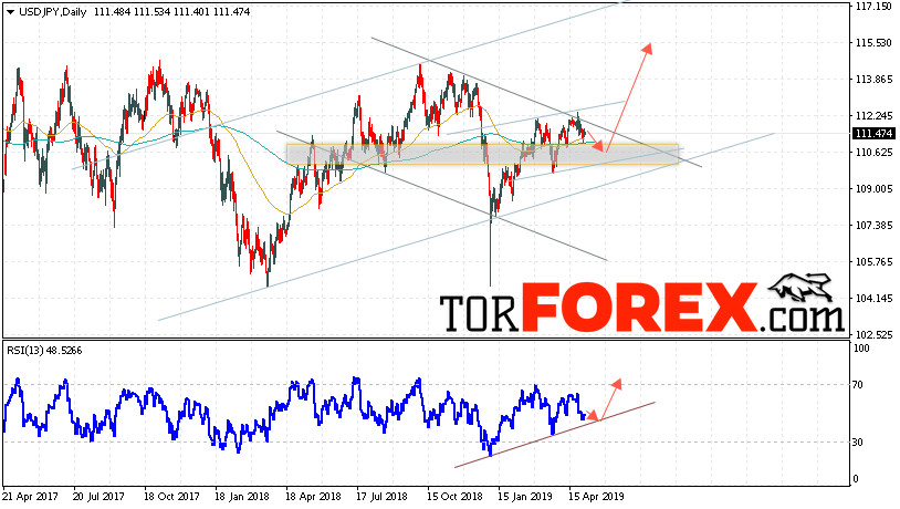 Таким образом, USD/JPY прогноз Доллар Иена на 6 — 10 мая 2019 предполагает попытку теста уровня поддержки вблизи области 110.65. Откуда стоит ожидать продолжения роста пары в область выше уровня 115.55. Дополнительным сигналом в пользу подъёма выступит тест линии тренда на индикаторе относительной силы. Отменой варианта роста пары станет падение и пробой уровня 108.45. Это укажет на продолжение снижения пары.