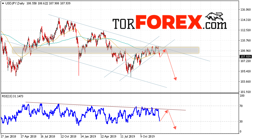 В пользу снижения пары Доллар Иена выступит тест линии сопротивления на индикаторе относительной силы. Вторым сигналом станет отскок от верхней границы нисходящего канала. Отменой варианта падения пары USD/JPY на текущей торговой неделе 6 — 10 января 2020 выступит сильный рост и пробой области 111.05. Такой вариант укажет на пробой области сопротивления и продолжение роста пары на Форекс в область выше уровня 114.15. Подтверждением падения по паре USD/JPY выступит пробой области поддержки и закрытие под уровнем 106.95.