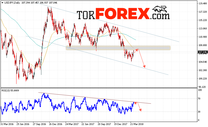 Таким образом, USD/JPY прогноз Доллар Иена на неделю 9 — 13 апреля 2018 предполагает попытку теста верхней границы канала вблизи области 107.50, откуда стоит ожидать продолжения падения пары в область ниже уровня 102.50, дополнительным сигналом в пользу падения выступит тест линии тренда на индикаторе относительной силы, отменой варианта падения пары станет пробой уровня 108.80, что укажет на продолжение роста пары.