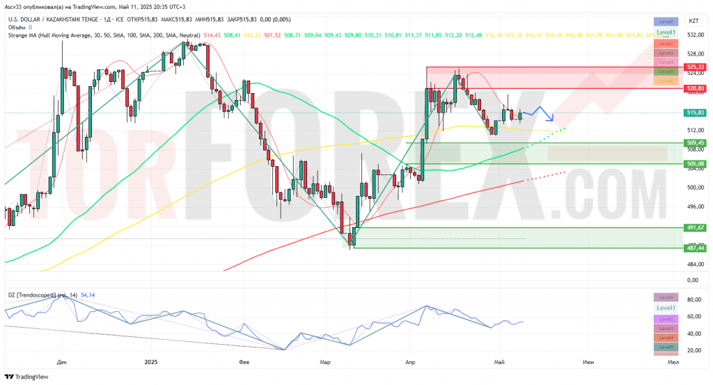 Отказ от пробоя 520 может привести к снижению курса в область 509–505. В случае усиления давления целью может стать уровень 491,67 тенге.