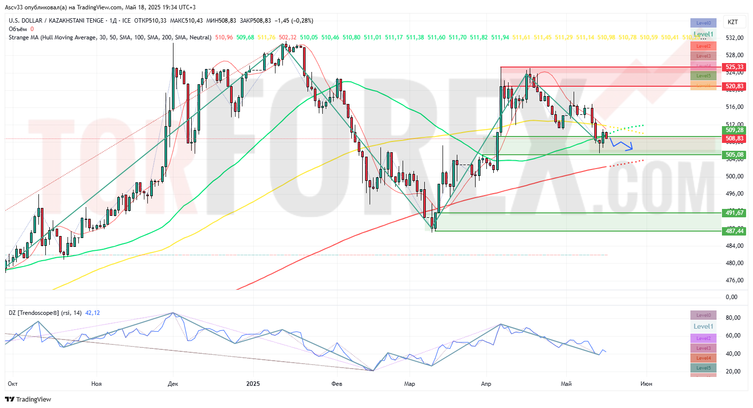 USD/KZT остаётся под давлением, и до закрепления выше 512–515 базовый сценарий — умеренное снижение. Ближайшая цель внизу — 491.67. В случае пробоя уровня 505 сигнал на продажу усилится.