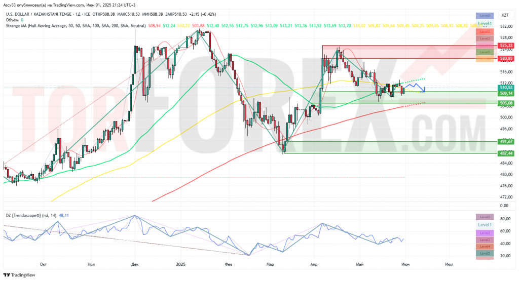 Пробой поддержки 509 с закреплением может привести к падению к 505 и далее к 491–487. Это усилит сигналы на разворот в пользу тенге.