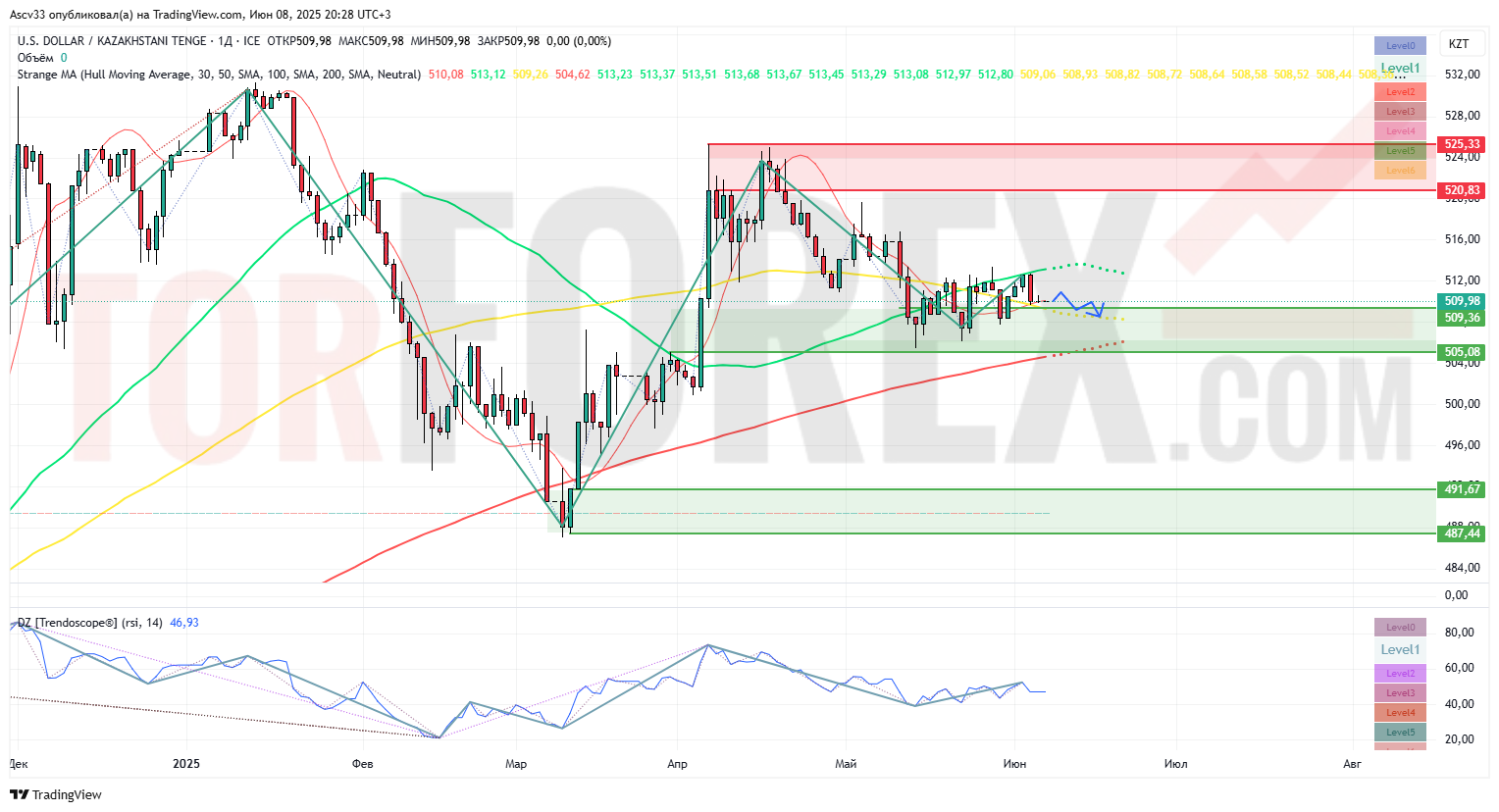 Пара USD/KZT завершила неделю в узком боковом диапазоне, замерев у границы среднесрочной поддержки. Отскоки вверх выглядят вялыми, а снижение ограничивается уровнем в районе 509–505. Рынок демонстрирует признаки консолидации вблизи ключевой поддержки, что может предвещать выход из фазы неопределённости в ближайшие дни.