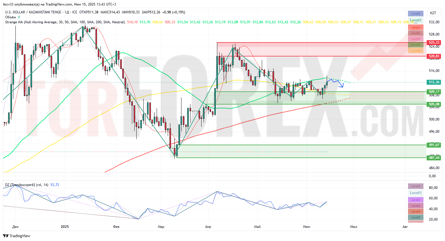 Пара USD/KZT балансирует на грани — локальный тренд теряет импульс, но ещё не перешёл в полноценное снижение. Технически предпочтение остаётся за откатом от текущих уровней с потенциалом снижения к 505.