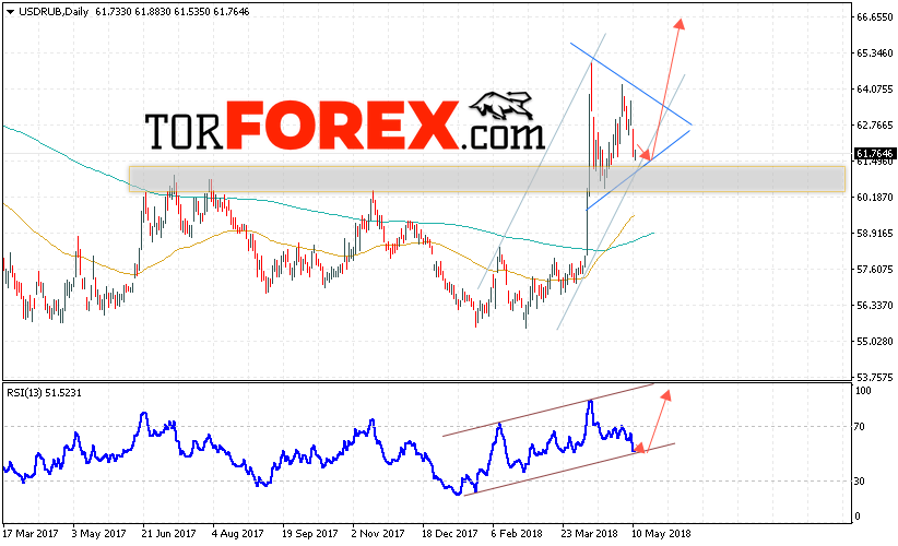 Таким образом, USD/RUB прогноз Доллара на неделю 14 — 18 мая 2018 предполагает попытку теста области поддержки вблизи уровня 61.40, откуда стоит ожидать попытку роста Доллара в область выше уровня 66.50, в пользу роста пары выступит тест нижней границы канала на индикаторе относительной силы, отменой варианта роста курса Доллара на текущей торговой неделе станет падение и пробой области 60.00, что укажет на продолжение падения пары.