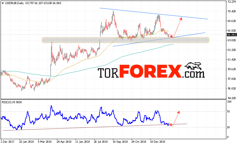 Таким образом, USD/RUB прогноз Доллара на 28 января — 1 февраля 2019 предполагает попытку теста области поддержки вблизи уровня 65.90. Откуда стоит ожидать попытку роста Доллара в область выше уровня 68.55. В пользу роста пары выступит тест линии тренда на индикаторе относительной силы. Отменой варианта роста курса Доллара на текущей торговой неделе станет снижение и пробой области 64.80. Что укажет на продолжение падения пары.