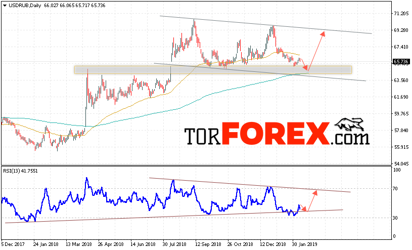 Валютная пара Доллар Рубль USD/RUB завершает торговую неделю вблизи уровня 65.73 Рублей за Доллар США. Пара продолжает движение в рамках коррекции. Скользящие средние указывают на наличие восходящей тенденции. На текущей торговой неделе 11 — 15 февраля 2019 стоит ожидать снижение и тест области поддержки вблизи уровня 64.55. Откуда стоит ожидать отскок и продолжение роста курса Доллара выше уровня 69.05.