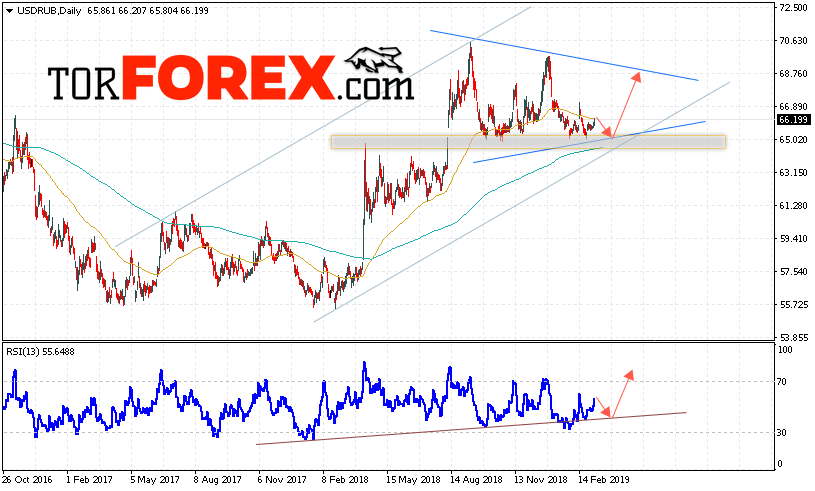 Валютная пара Доллар Рубль USD/RUB завершает торговую неделю вблизи уровня 66.19 Рублей за Доллар США. Пара продолжает движение в рамках коррекции и формирования модели «Треугольник». Скользящие средние указывают на наличие восходящей тенденции. На текущей торговой неделе 11 — 15 марта 2019 стоит ожидать снижение и тест области поддержки вблизи уровня 65.25. Откуда стоит ожидать отскок и продолжение роста курса Доллара выше уровня 68.75.