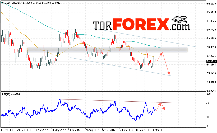 Таким образом, USD/RUB прогноз Доллара на неделю 12 — 16 марта 2018 предполагает попытку теста области сопротивления вблизи уровня 57.60, откуда стоит ожидать попытку падения Доллара в область ниже уровня 55.20, в пользу падения пары выступит тест линии тренда на индикаторе относительной силы, отменой варианта падения курса Доллара на текущей торговой неделе станет сильный рост и пробой области 59.50, что укажет на продолжение роста.