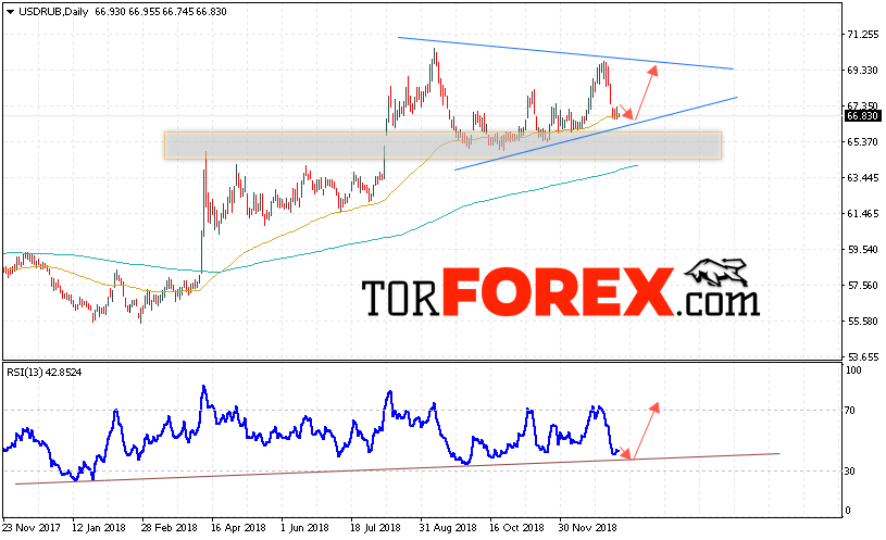 Таким образом, USD/RUB прогноз Доллара на неделю 14 — 18 января 2019 предполагает попытку теста области поддержки вблизи уровня 67.55. Откуда стоит ожидать попытку роста Доллара в область выше уровня 69.35. В пользу роста пары выступит тест линии тренда на индикаторе относительной силы. Отменой варианта роста курса Доллара на текущей торговой неделе станет снижение и пробой области 65.30. Что укажет на продолжение падения пары.