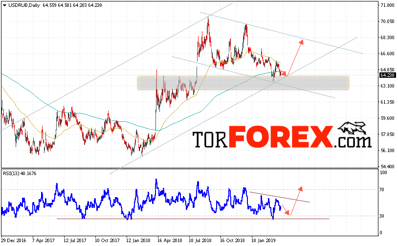 Валютная пара Доллар Рубль USD/RUB завершает торговую неделю вблизи уровня 64.23 Рублей за Доллар США. Пара продолжает движение в рамках коррекции. Скользящие средние указывают на наличие восходящей тенденции. На текущей торговой неделе 15 — 19 апреля 2019 стоит ожидать снижение и тест области поддержки вблизи уровня 64.05. Откуда стоит ожидать отскок и продолжение роста курса Доллара выше уровня 67.95.