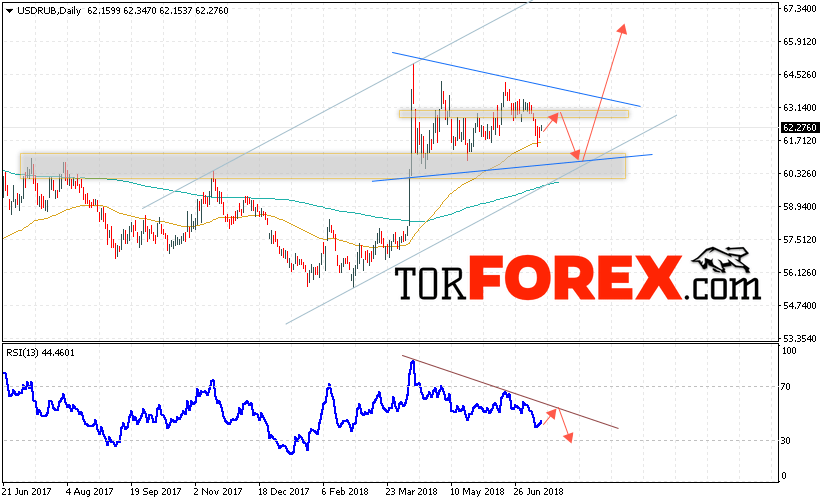 Таким образом, USD/RUB прогноз Доллара на неделю 16 — 20 июля 2018 предполагает попытку теста области сопротивления вблизи уровня 63.00, откуда стоит ожидать попытку падения Доллара в область ниже уровня 60.00, в пользу снижения пары выступит тест нисходящей линии тренда на индикаторе относительной силы, отменой варианта падения курса Доллара на текущей торговой неделе станет сильный рост и пробой области 63.00, что укажет на продолжение роста пары.