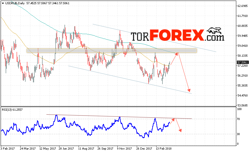 Таким образом, USD/RUB прогноз Доллара на неделю 19 — 23 марта 2018 предполагает попытку теста области сопротивления вблизи уровня 57.50, откуда стоит ожидать попытку падения Доллара в область ниже уровня 55.20, в пользу падения пары выступит тест линии тренда на индикаторе относительной силы, отменой варианта падения курса Доллара на текущей торговой неделе станет сильный рост и пробой области 59.50, что укажет на продолжение роста.