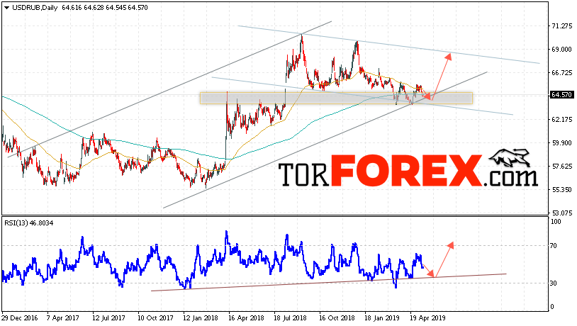 Валютная пара Доллар Рубль USD/RUB завершает торговую неделю вблизи уровня 64.57 Рублей за Доллар США. Пара продолжает движение в рамках нисходящего канала. Скользящие средние указывают на наличие восходящей тенденции. На текущей торговой неделе 20 — 24 мая 2019 стоит ожидать снижение и тест области поддержки вблизи уровня 64.05. Откуда стоит ожидать отскок и продолжение роста курса Доллара выше уровня 68.35.