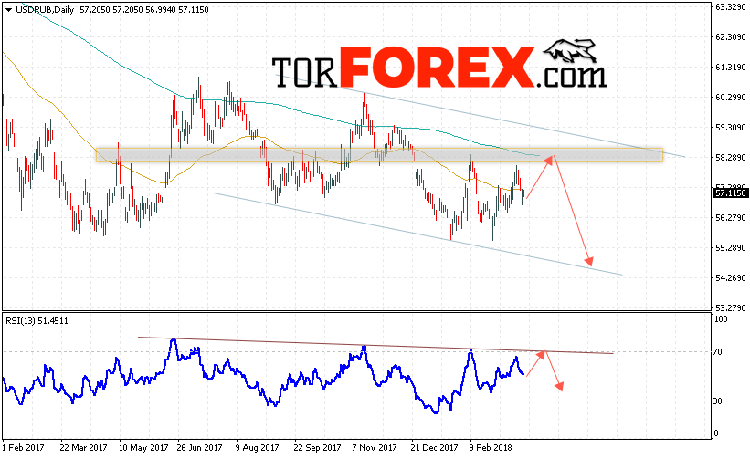 В пользу падения пары Доллар Рубль выступит тест линии сопротивления на индикаторе относительной силы. Отменой варианта продолжения падения пары Доллар Рубль станет сильный рост и пробой области 59.50, что укажет на пробой верхней границы нисходящего канала и продолжение роста курса Доллара США против Российского Рубля. Ожидать ускорения роста пары стоит с пробоем области поддержки и закрытием ниже уровня 56.10.